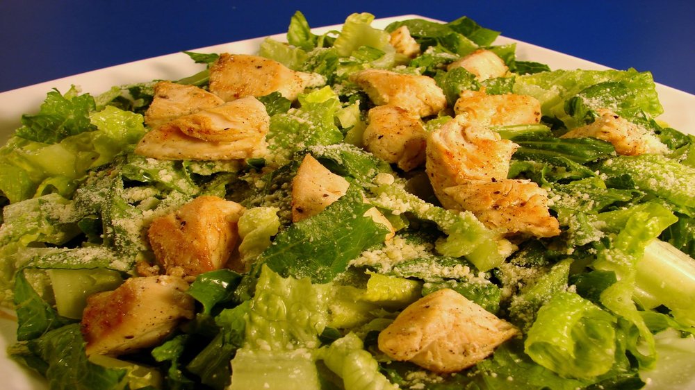 Fresh romaine lettuce, tomato, red onions, cucumbers, cheddar jack cheese, black beans, grilled chicken, and choice of sauce. 845 calories.