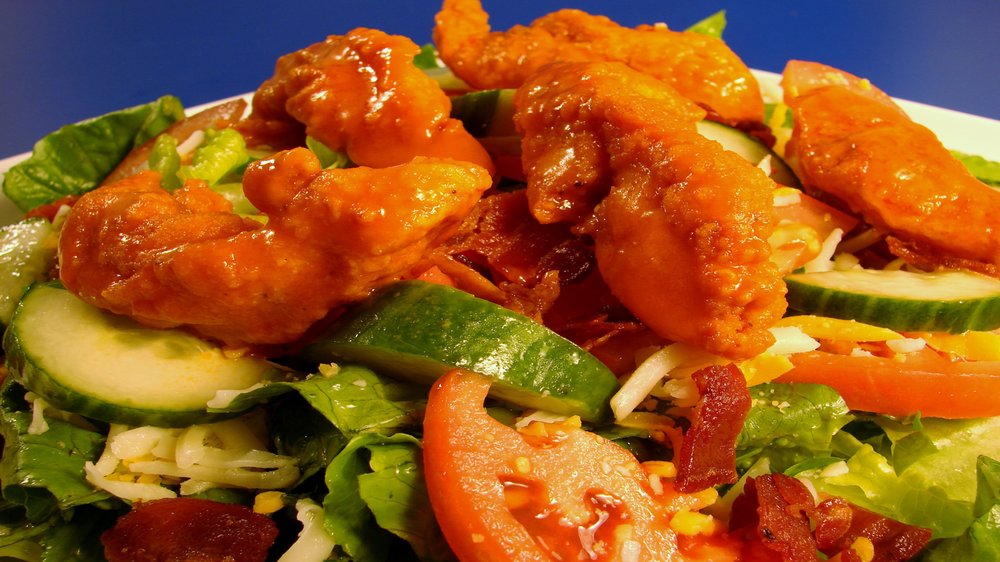 Boneless wings smothered in your favorite sauce, bacon, romaine lettuce. Tomato, cucumbers, and cheddar jack cheese. 1365 calories.